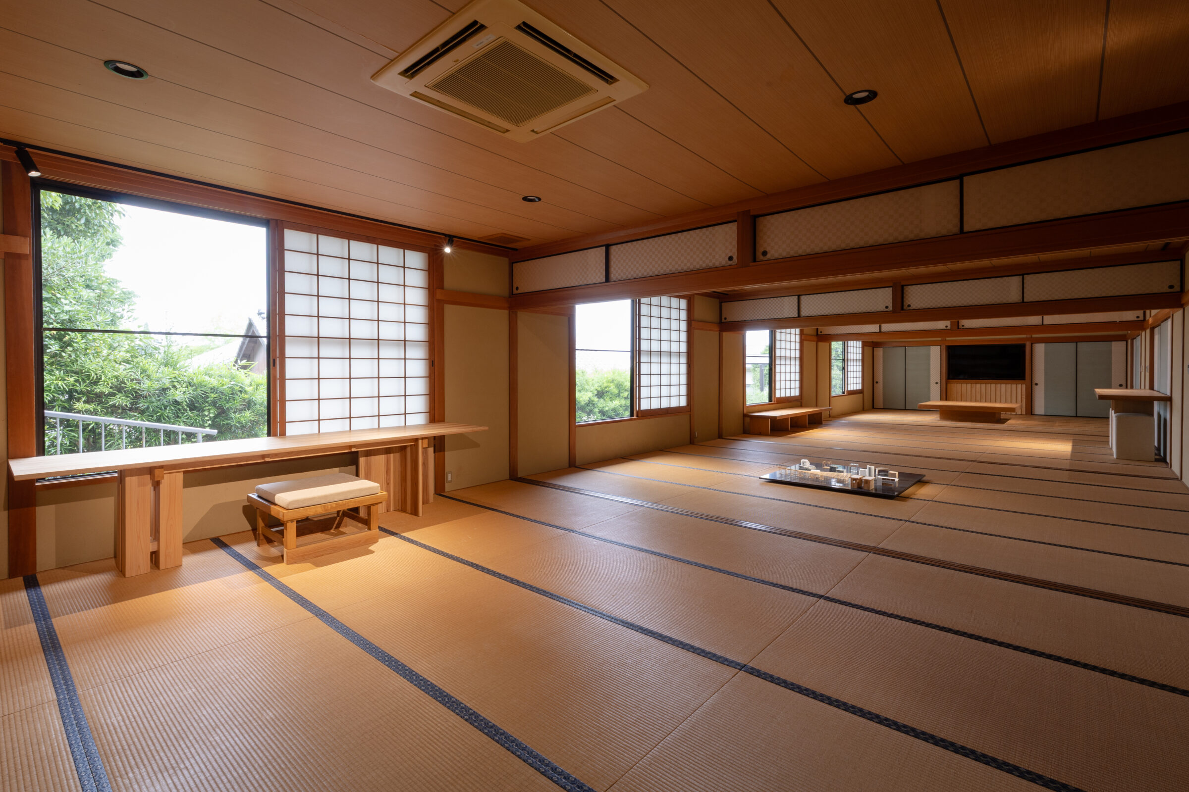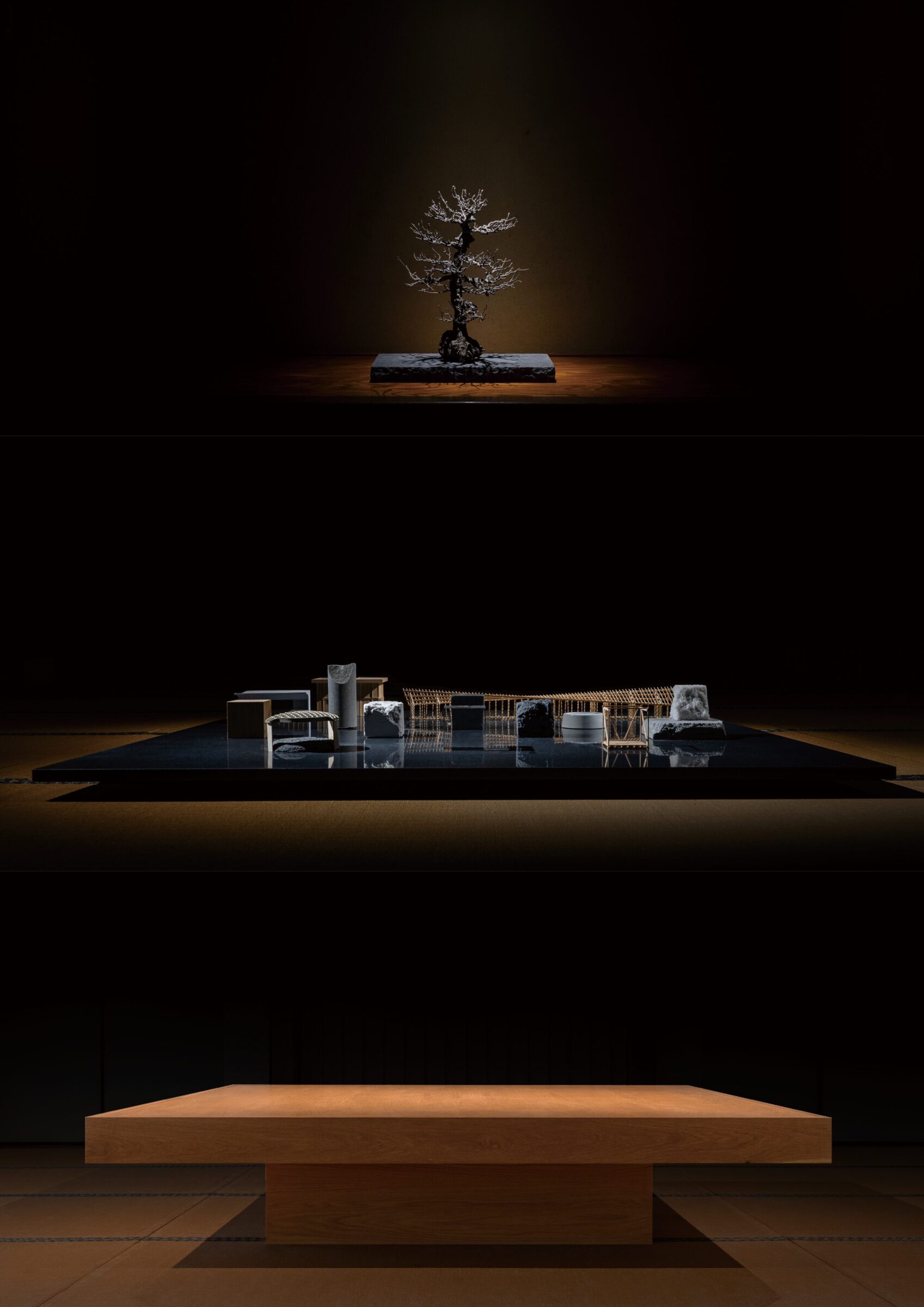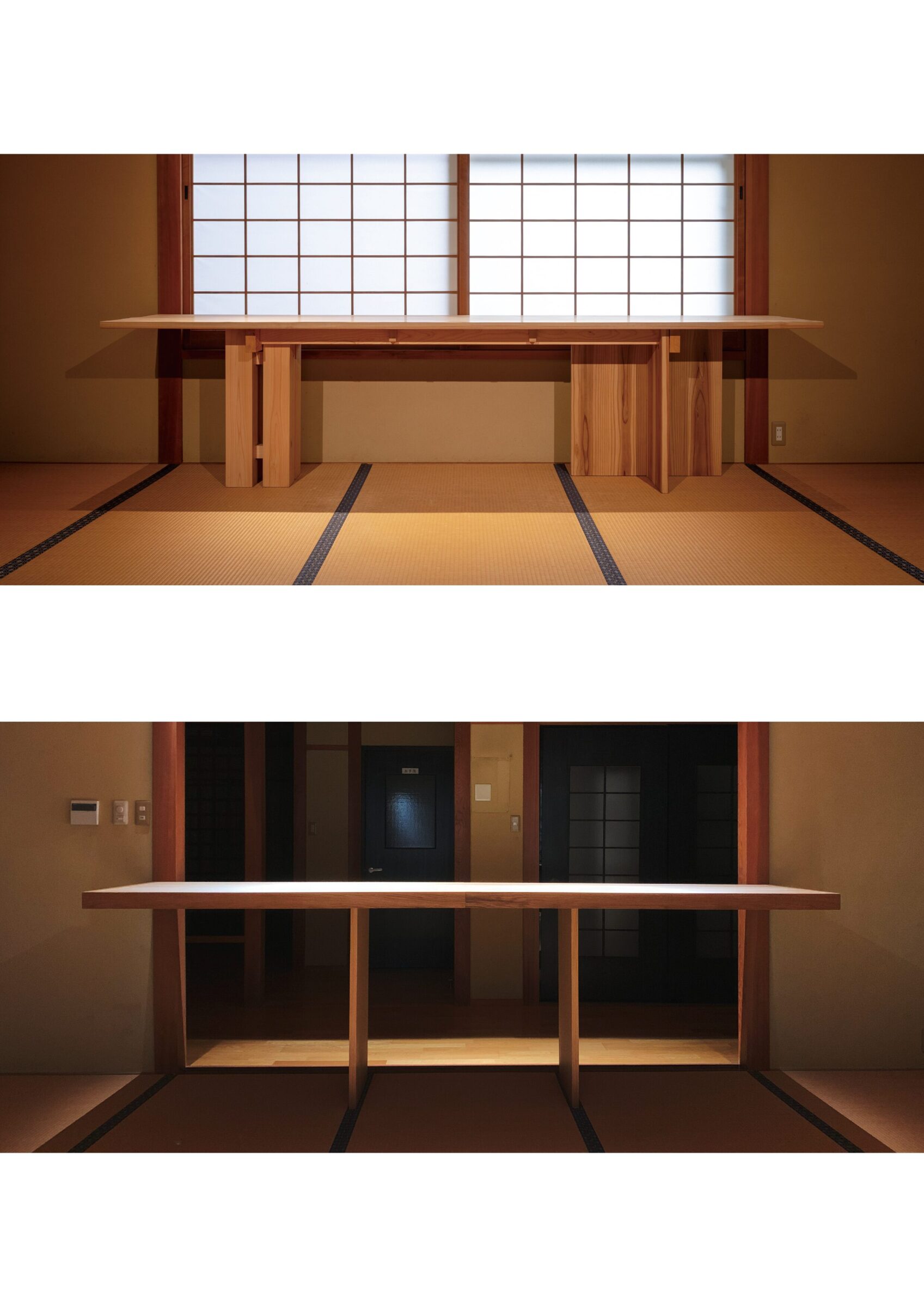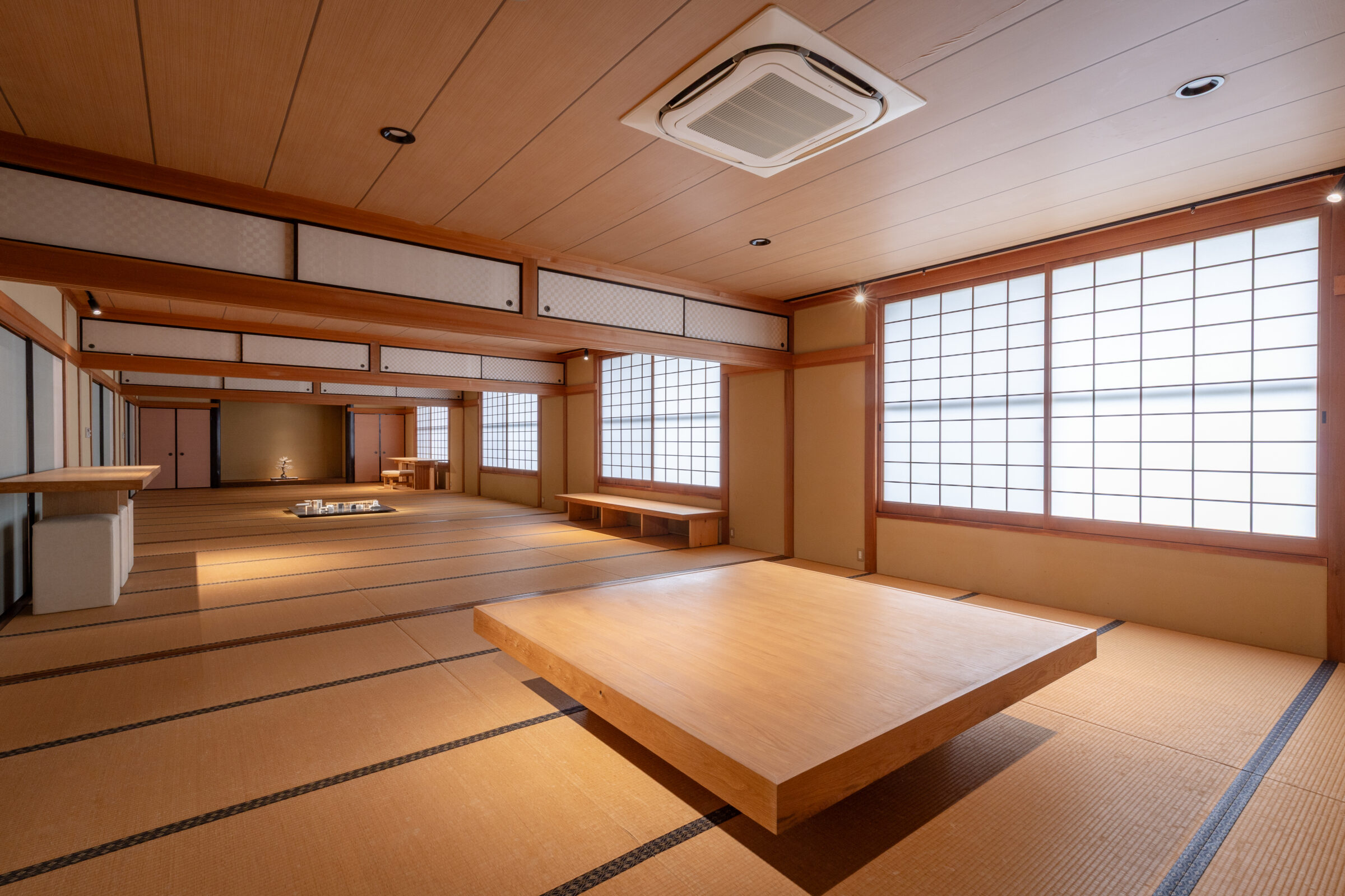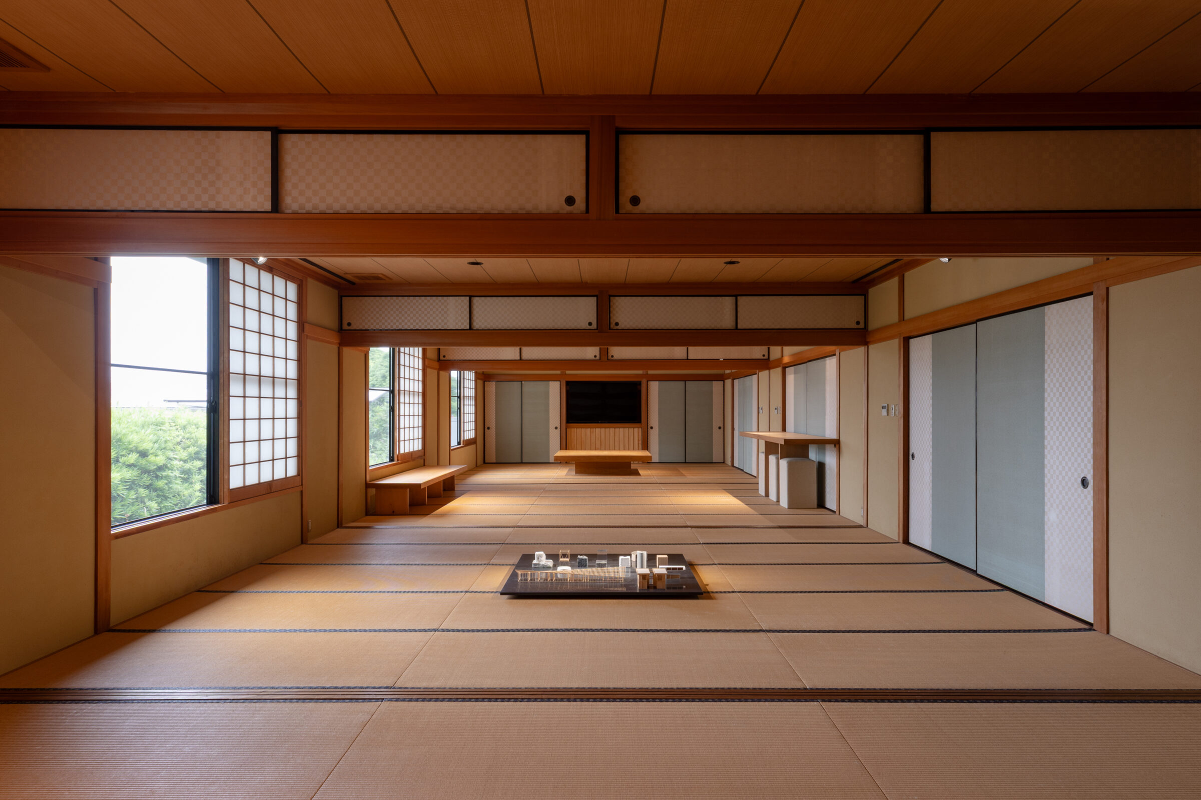 入母屋造りの伝統的な様式である建築をオフィス兼ギャラリーに改装する計画。60帖の大広間や、黒檀の柱を用いた床の間など、既存建築の躯体がもつ美しい骨格の一部となるような什器と設えを計画した。各広間に幾何学造形から発想した什器を設計し、既存建築と調和するように計画した。左右にある3つのテーブルは既存建築の柱割りの985mmグリッドに合わせて計画することで元からそこに在るような調和を目指した。それに対して、中央の3つの什器は寸法を既存建築のグリッドとは敢えて合わせず、異質なものとして扱うことで空間に象徴的に浮かび上がることを意図した。20mの奥行がある大広間に対して、空間の背景として調和する部分と、象徴的なオブジェとなる部分を計画することで、一方向的な奥行のある建築のなかに中心的な磁場を形成した。視覚的には奥行の拡がりを保ちながら、空間体験的には訪れる人々が什器を囲むという中心性を創出した。