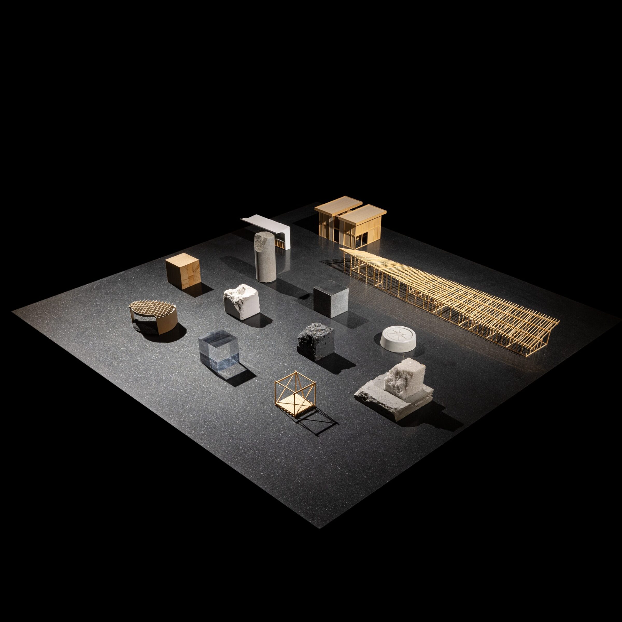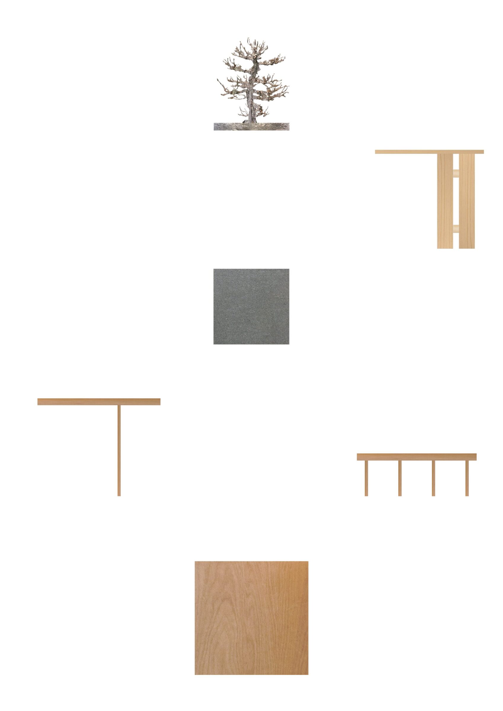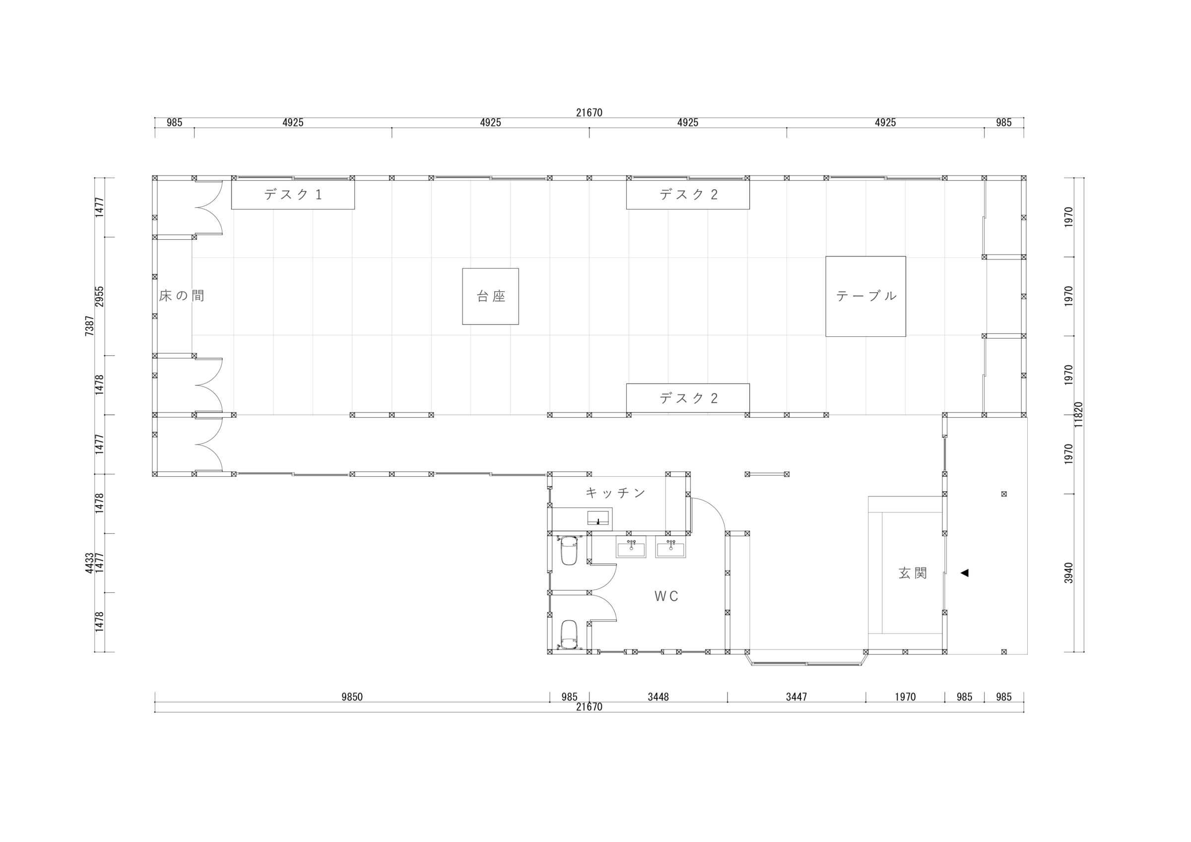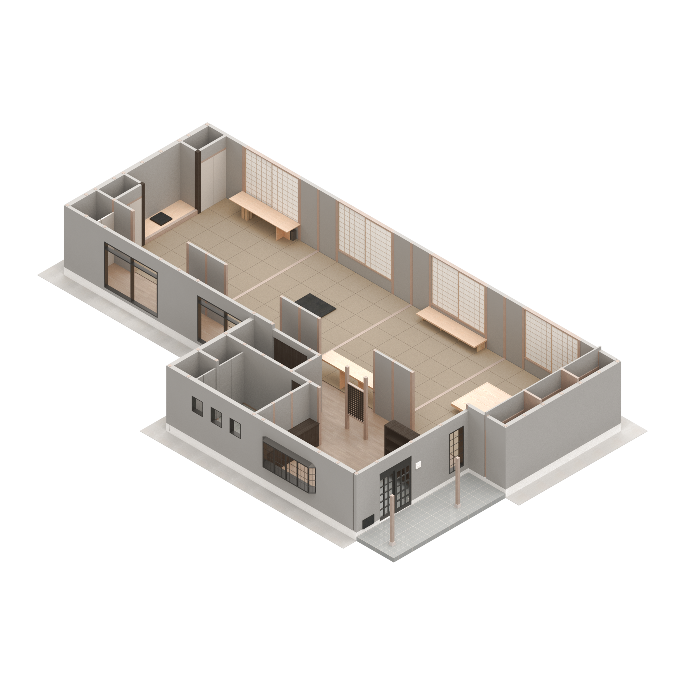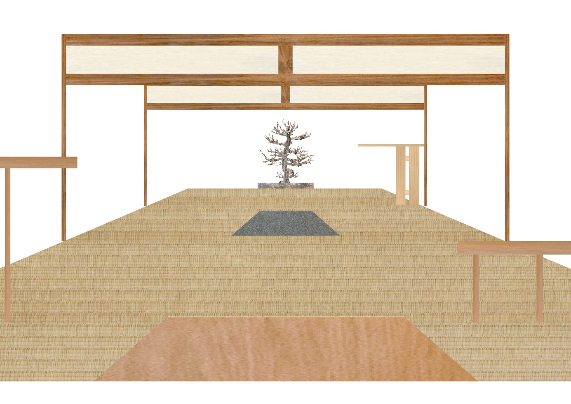 入母屋造りの伝統的な様式である建築をオフィス兼ギャラリーに改装する計画。60帖の大広間や、黒檀の柱を用いた床の間など、既存建築の躯体がもつ美しい骨格の一部となるような什器と設えを計画した。各広間に幾何学造形から発想した什器を設計し、既存建築と調和するように計画した。左右にある3つのテーブルは既存建築の柱割りの985mmグリッドに合わせて計画することで元からそこに在るような調和を目指した。それに対して、中央の3つの什器は寸法を既存建築のグリッドとは敢えて合わせず、異質なものとして扱うことで空間に象徴的に浮かび上がることを意図した。20mの奥行がある大広間に対して、空間の背景として調和する部分と、象徴的なオブジェとなる部分を計画することで、一方向的な奥行のある建築のなかに中心的な磁場を形成した。視覚的には奥行の拡がりを保ちながら、空間体験的には訪れる人々が什器を囲むという中心性を創出した。