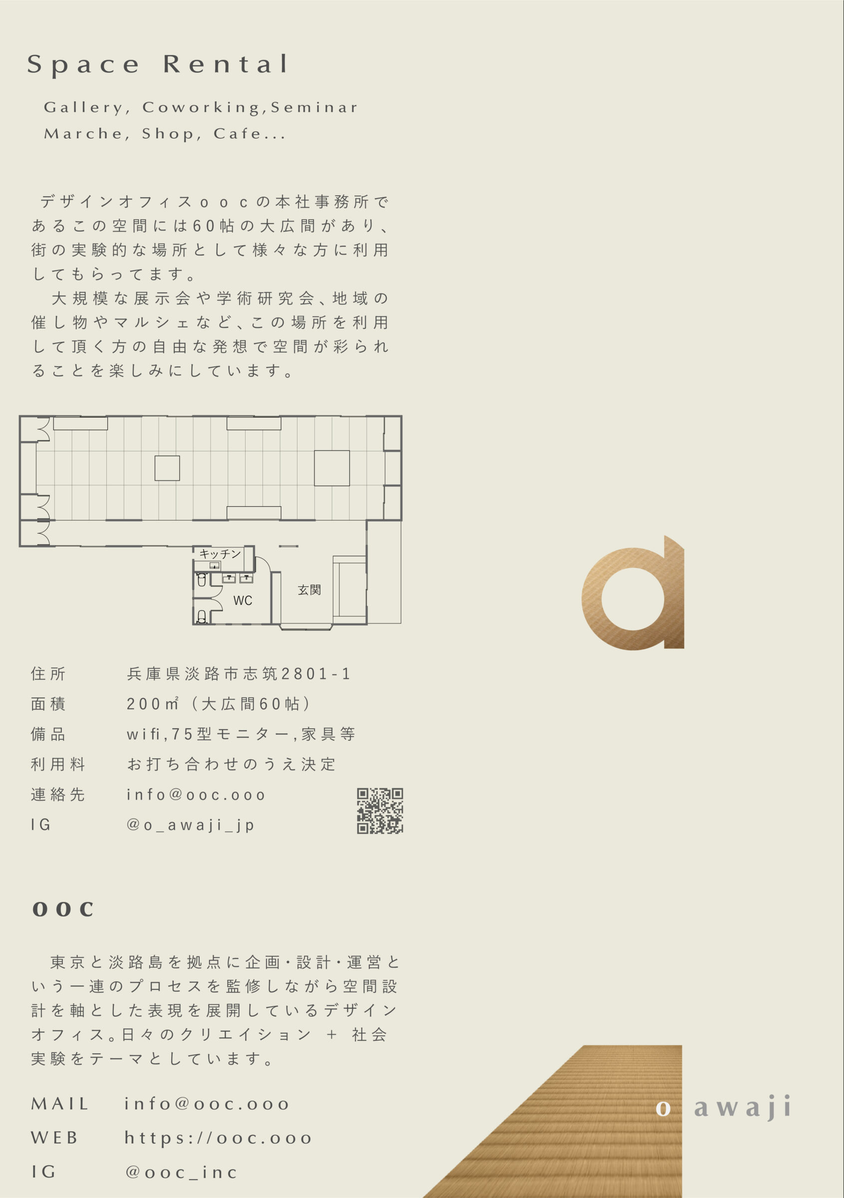 未分類o awaji10:15 PMo awajispace rental DM @o_awaji_jp デザインオフィスoocの本社事務所であるこの空間には60帖の大広間があり、街の実験的な場所として様々な方に利用してもらってます。大規模な展示会や学術研究会、地域の催し物やマルシェなど、この場所を利用して頂く方の自由な発想で空間が彩られることを楽しみにしています。office