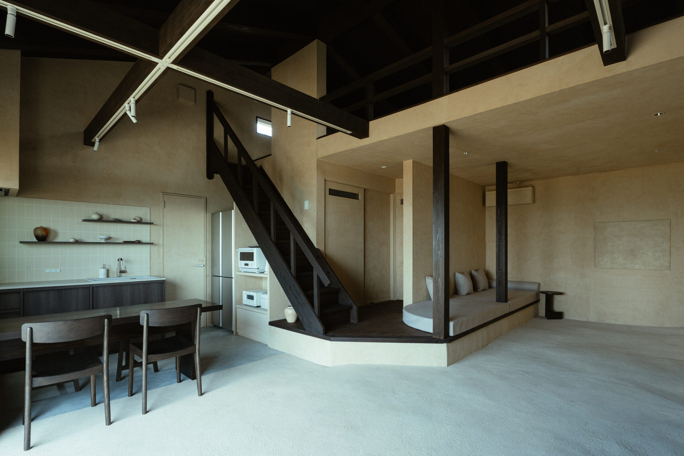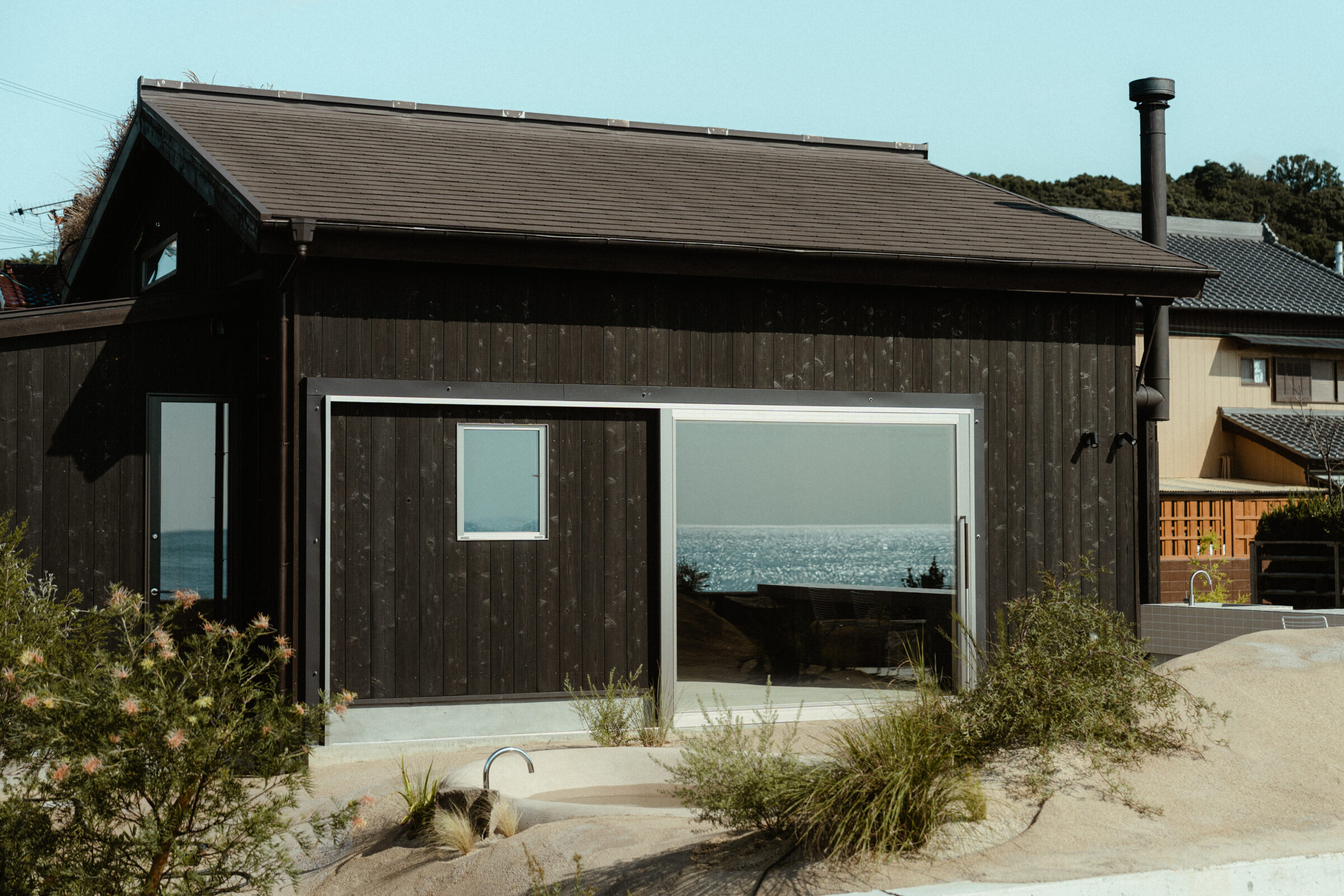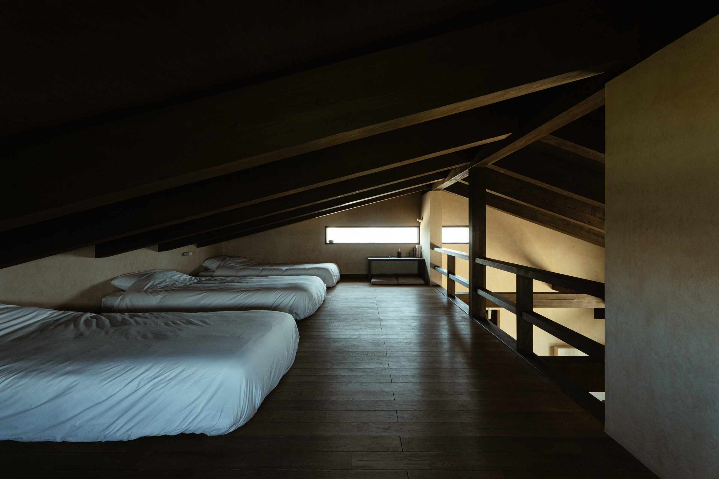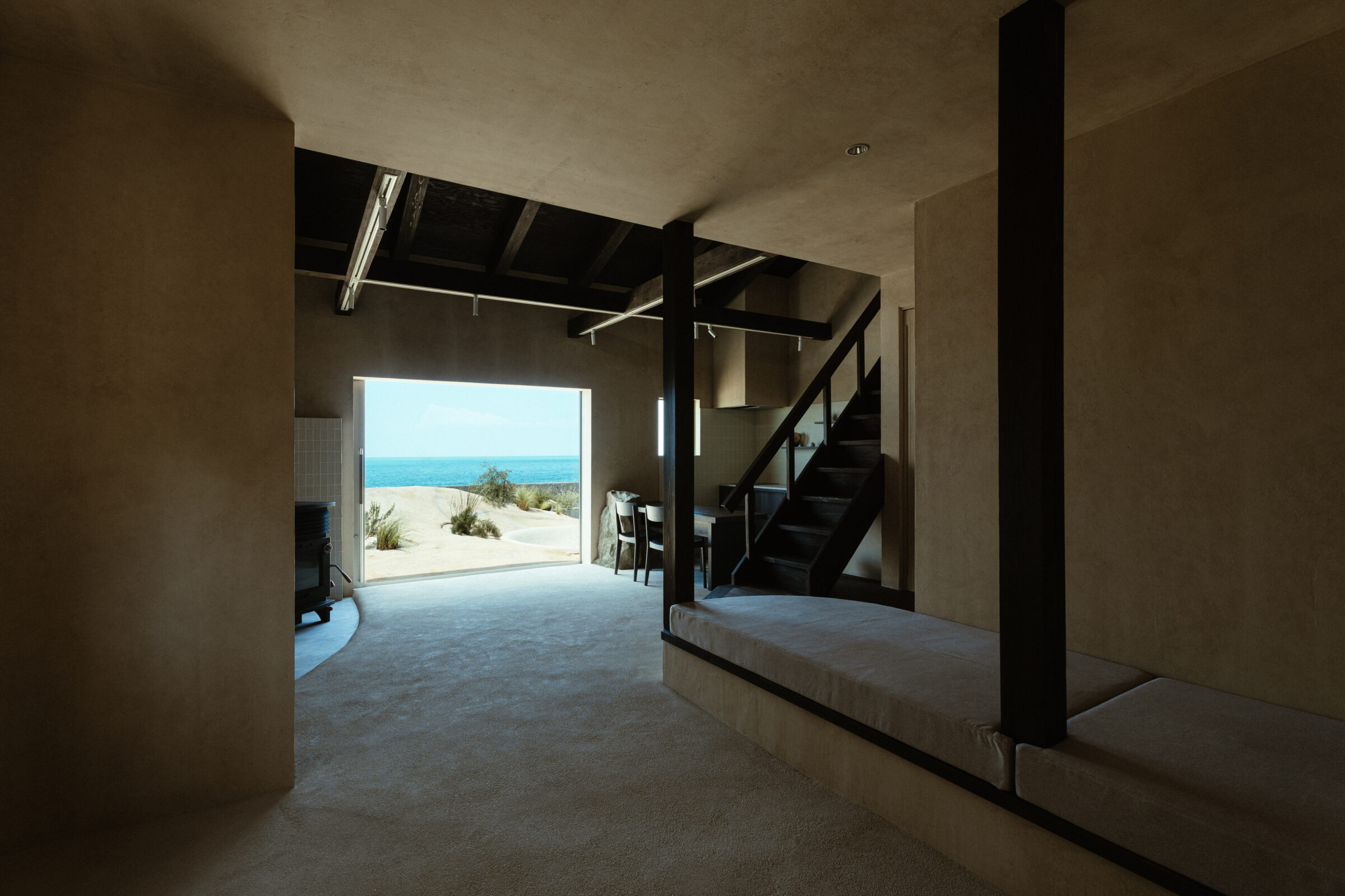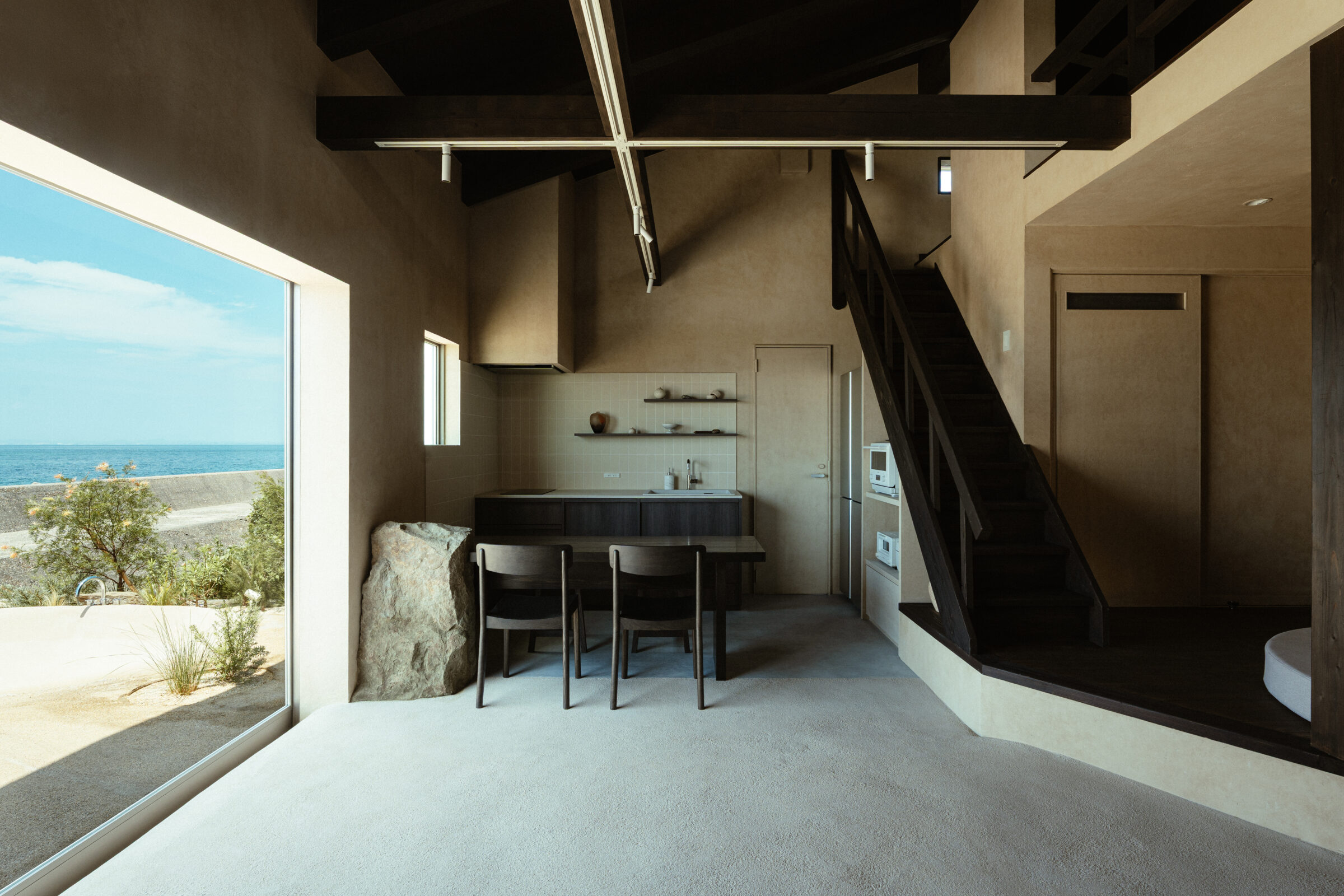 縷々という言葉は、長く静かにどこまでも続いていくことを意味している。縷々とした海の地平線に太陽が美しく落ちていく様子を眺めることができる住宅を宿泊施設として改修した。既存住宅の片側の屋根には芝生の草屋根が敷かれていることに着想を得て、山と海が縷々と繋がっていく大陸の構図をイメージし、起伏のある大地で建物の内と外を連続させた。草屋根は緩やかな山のかたちをなぞり、起伏のある大地は滞在する人々の居場所をつくり、ゆっくりと海へと導かれていく。ここでは海、大地、山の距離が近いという淡路島の風景の縮図を描いている。