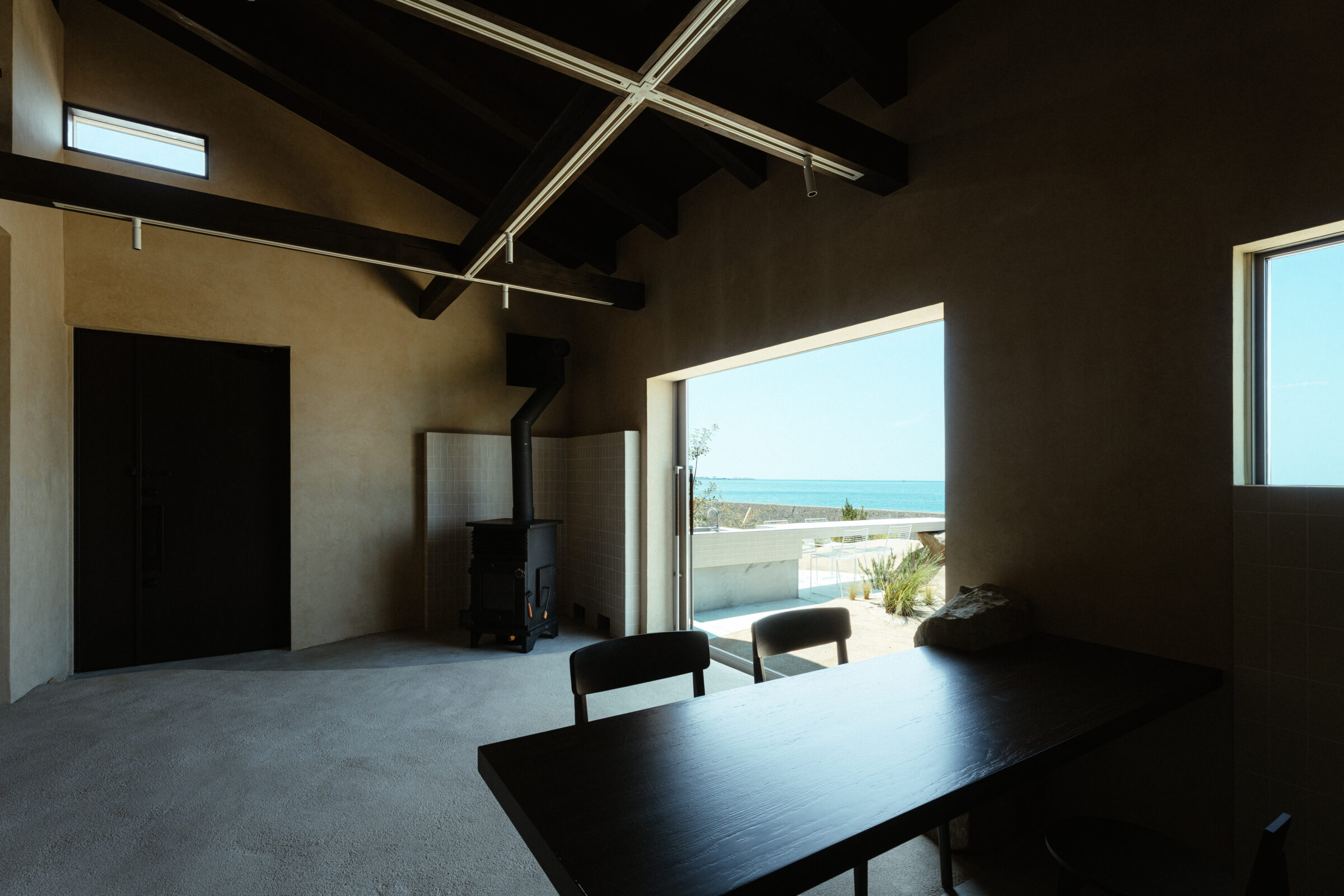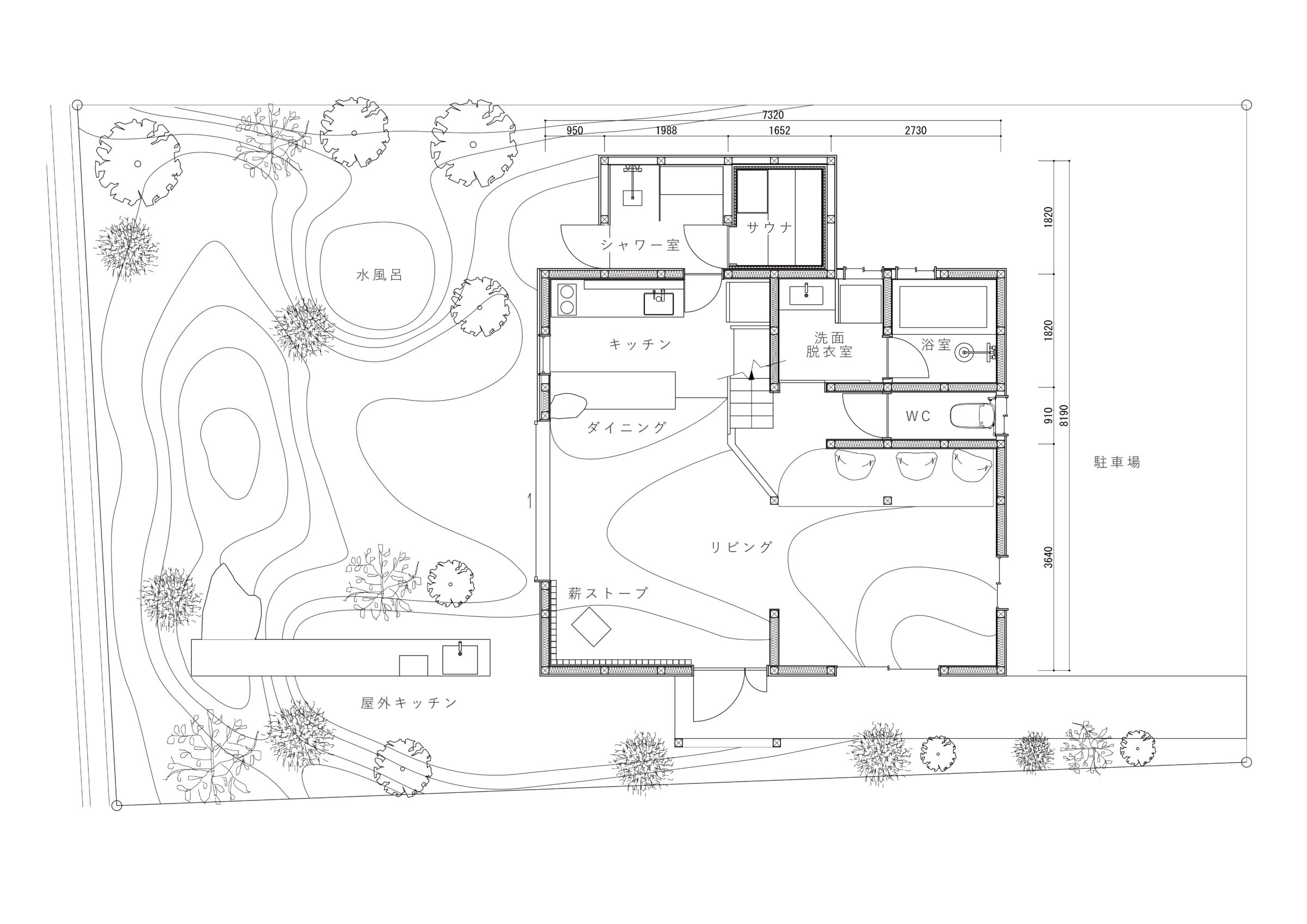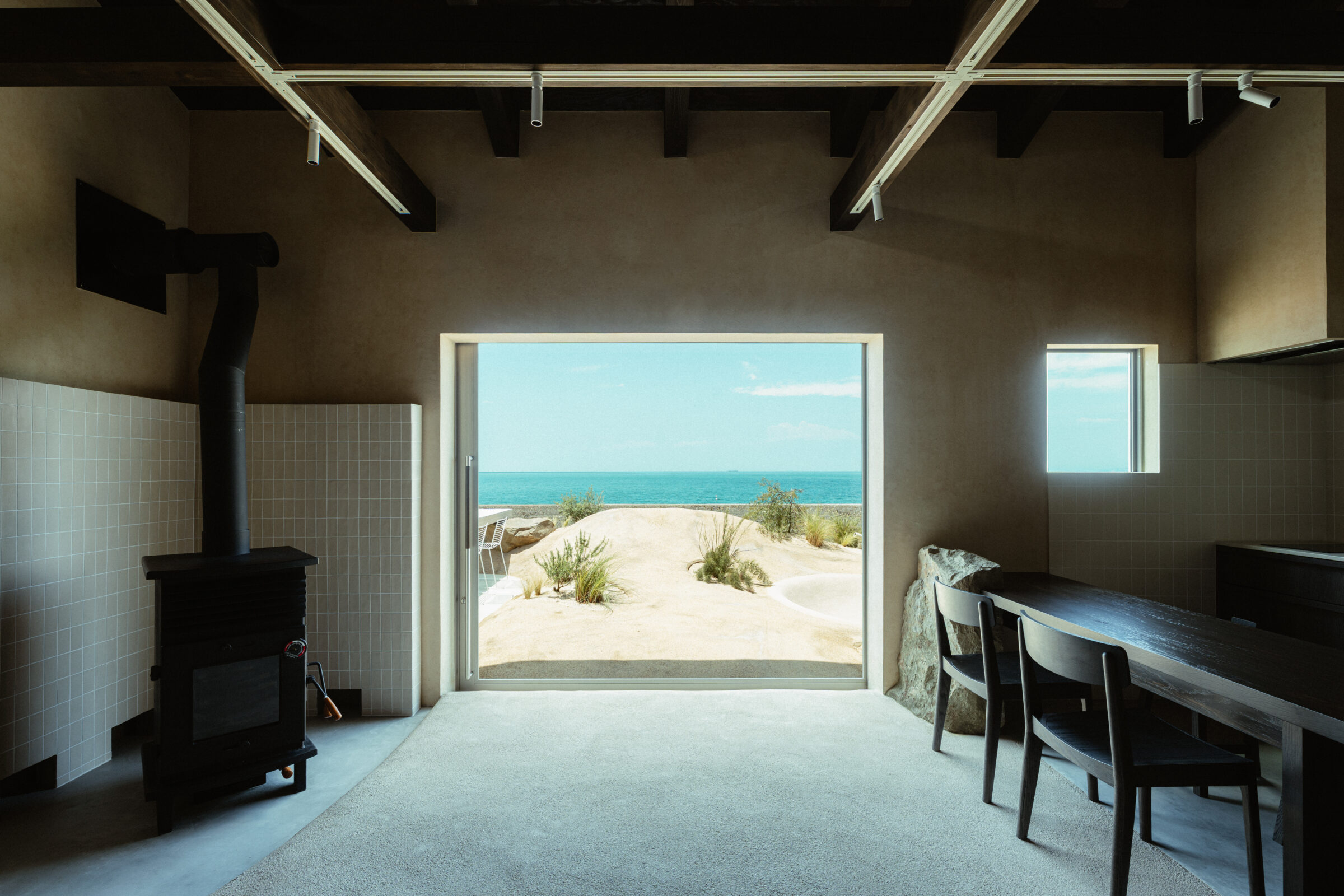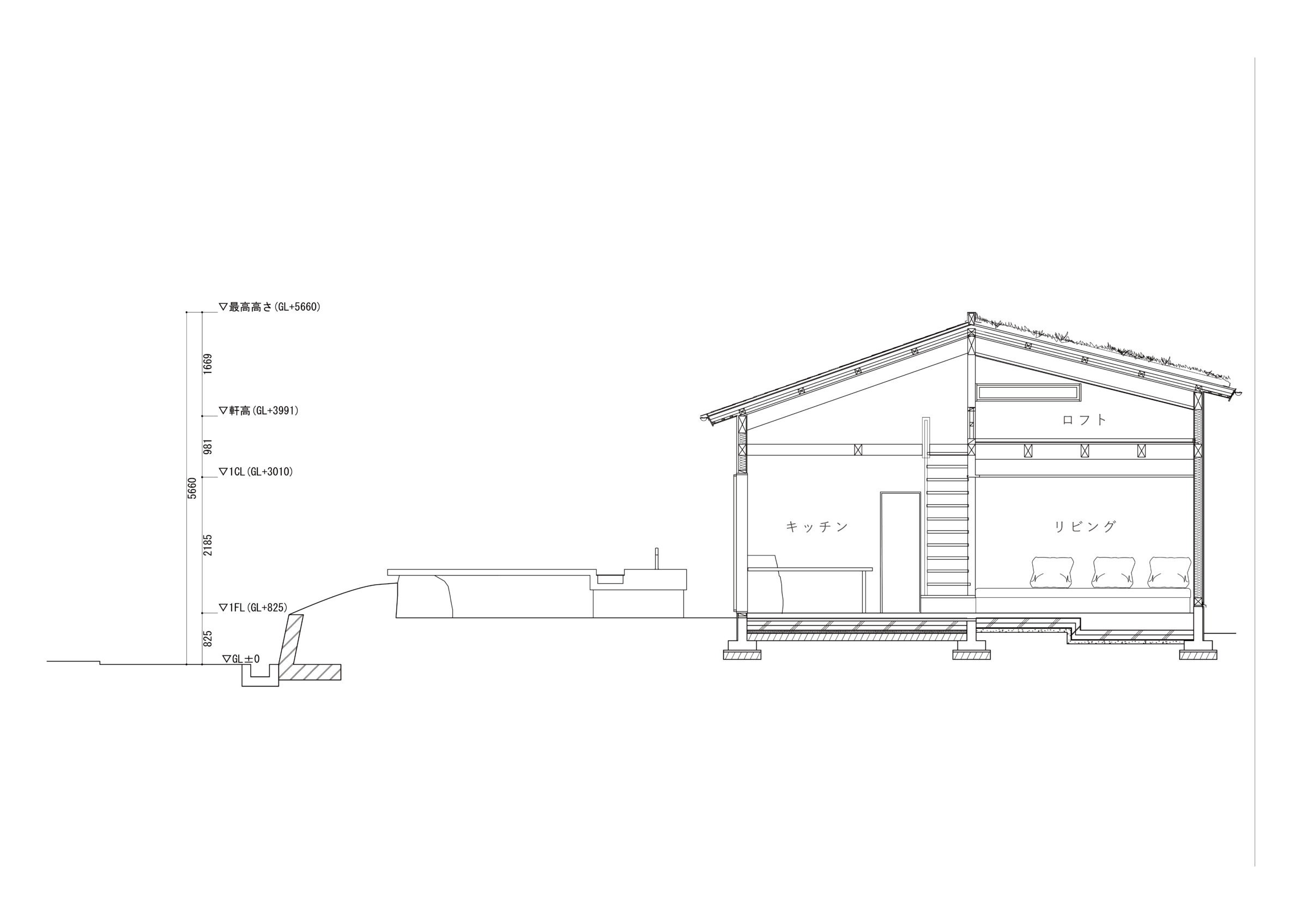 縷々という言葉は、長く静かにどこまでも続いていくことを意味している。縷々とした海の地平線に太陽が美しく落ちていく様子を眺めることができる住宅を宿泊施設として改修した。既存住宅の片側の屋根には芝生の草屋根が敷かれていることに着想を得て、山と海が縷々と繋がっていく大陸の構図をイメージし、起伏のある大地で建物の内と外を連続させた。草屋根は緩やかな山のかたちをなぞり、起伏のある大地は滞在する人々の居場所をつくり、ゆっくりと海へと導かれていく。ここでは海、大地、山の距離が近いという淡路島の風景の縮図を描いている。