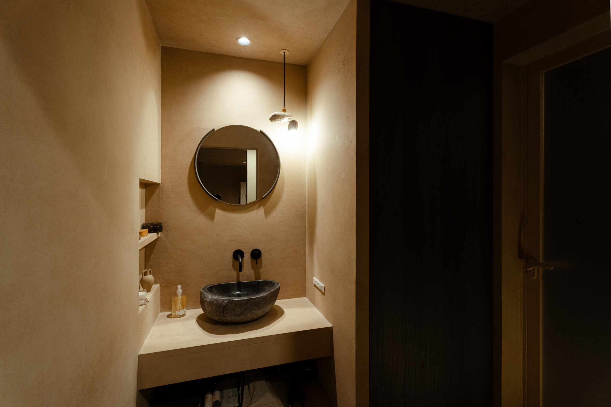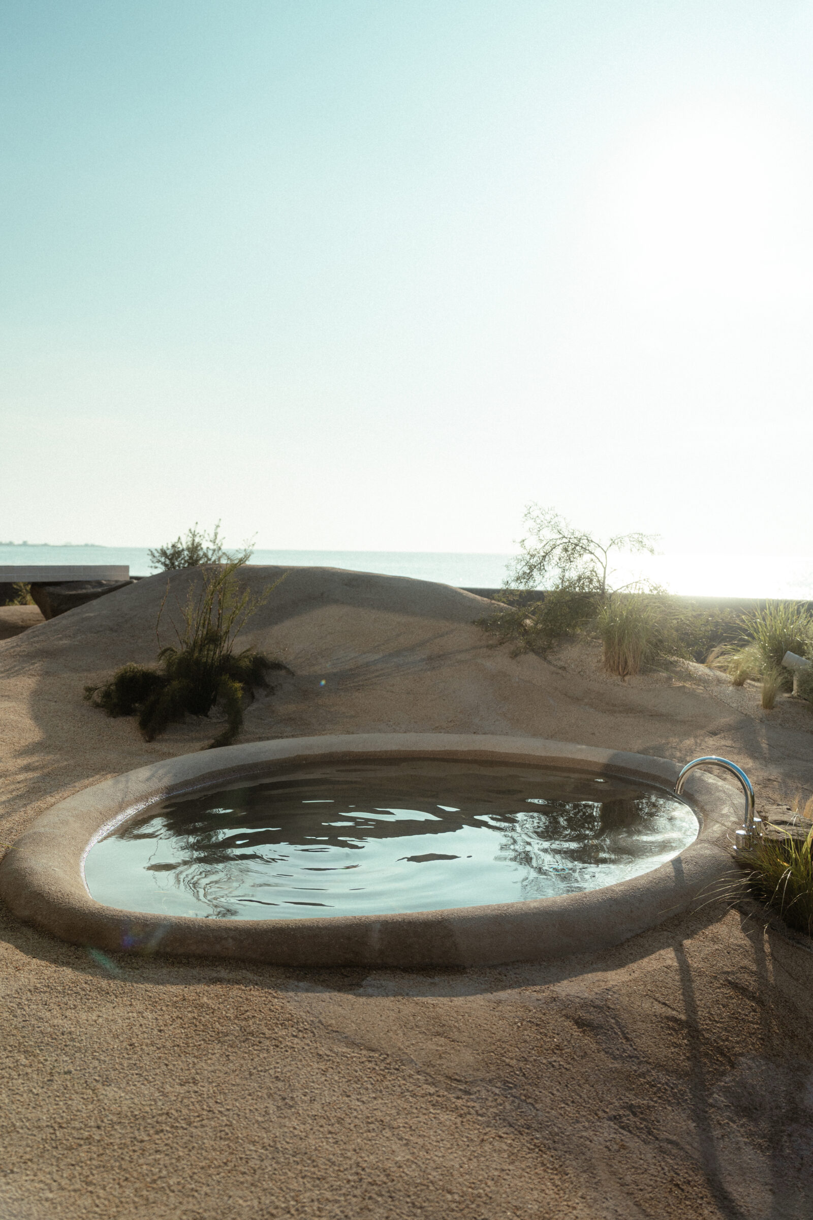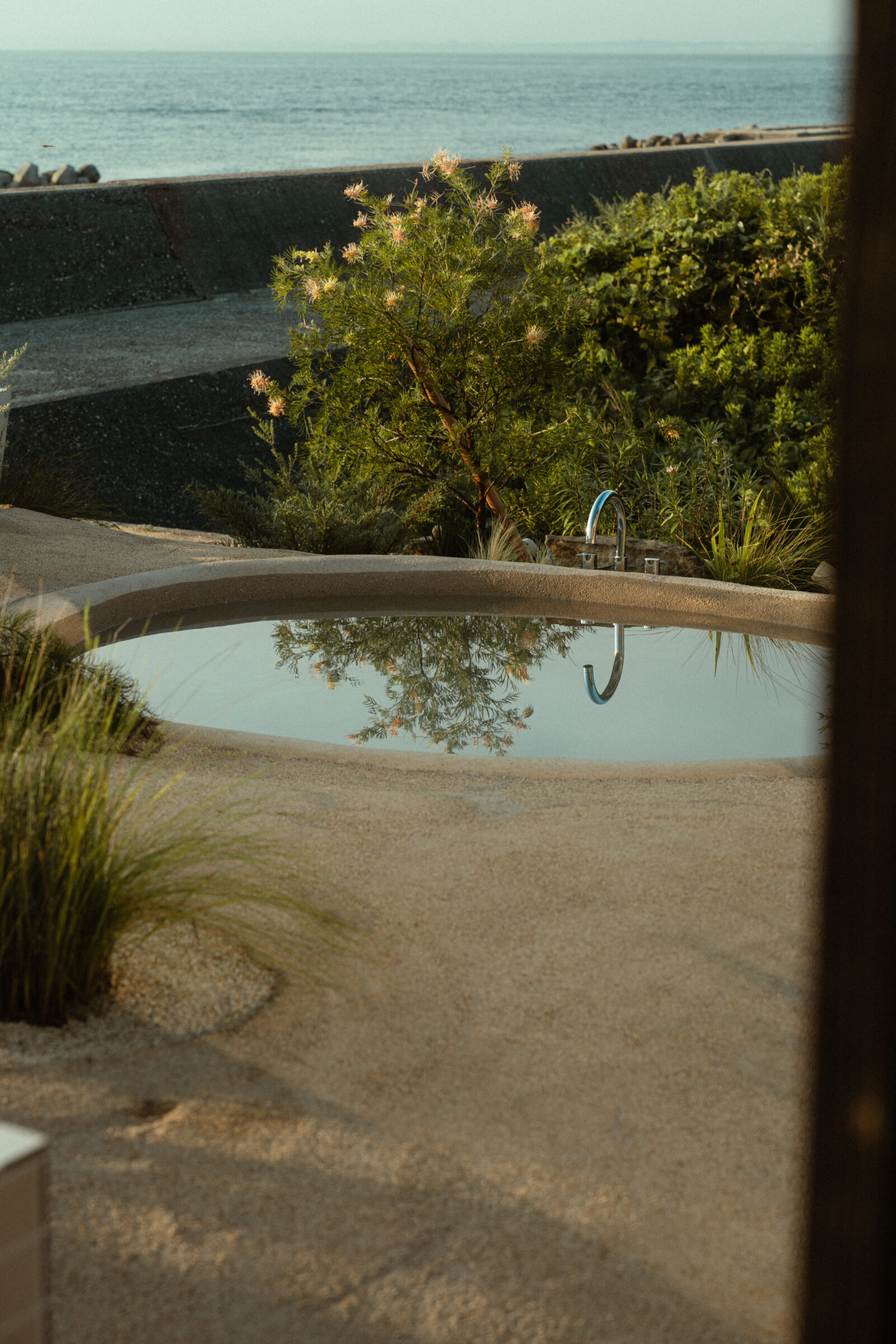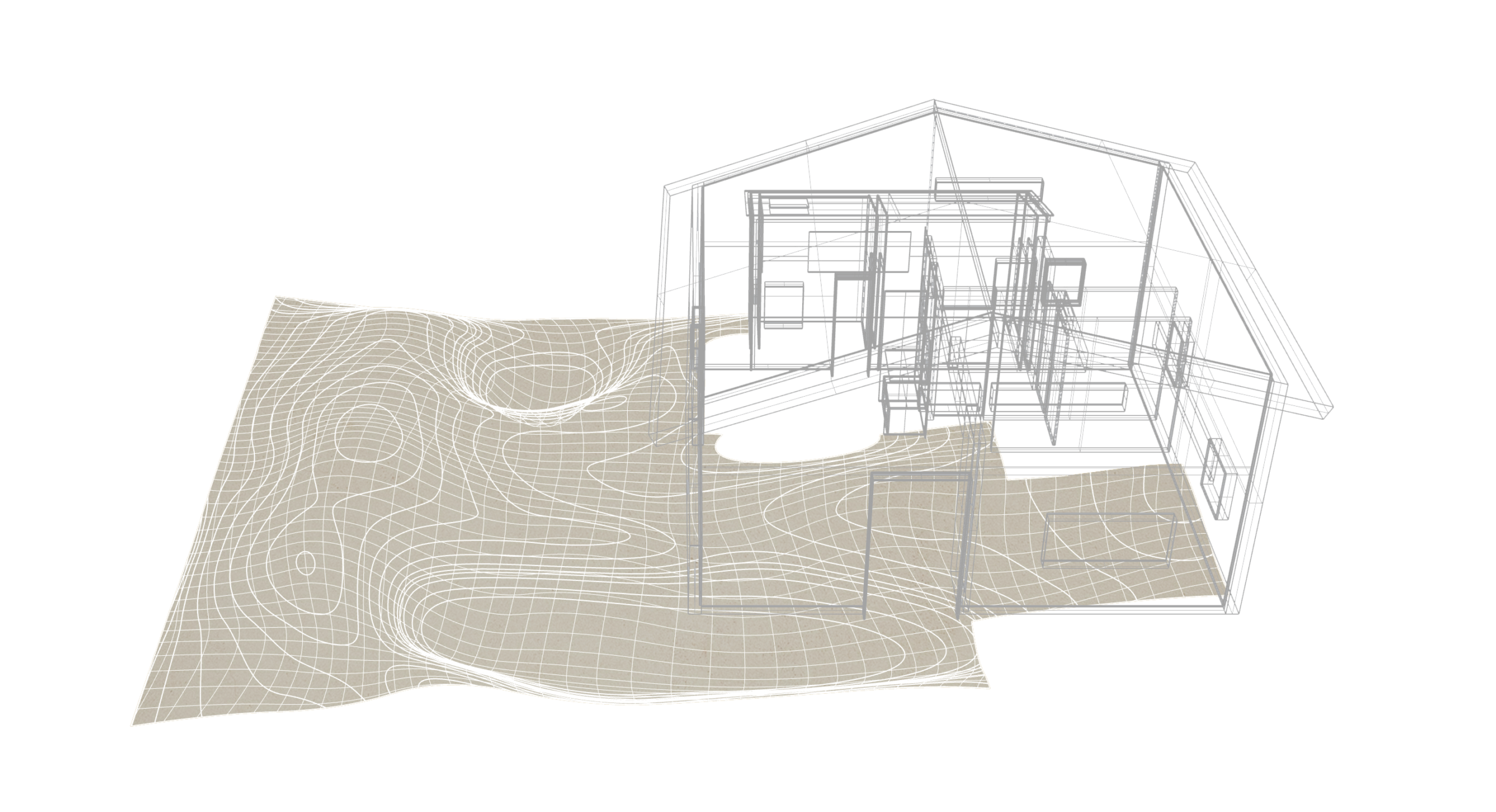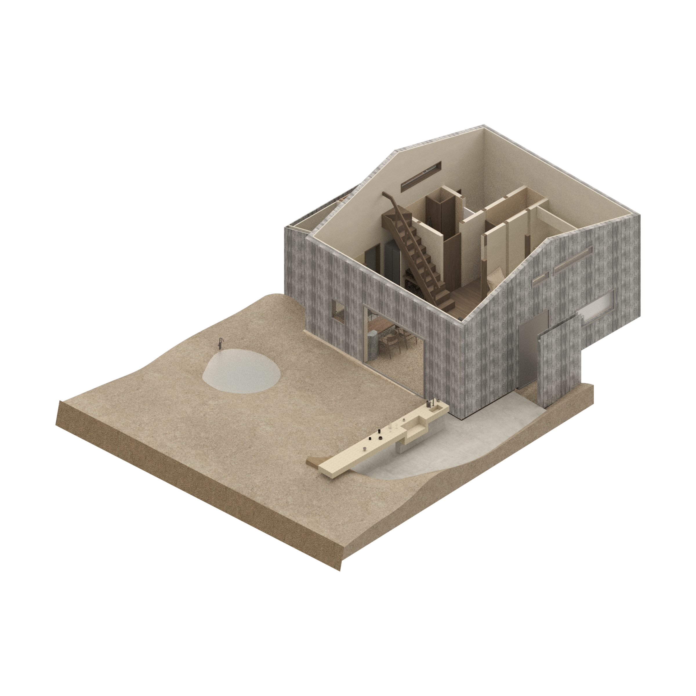 縷々という言葉は、長く静かにどこまでも続いていくことを意味している。縷々とした海の地平線に太陽が美しく落ちていく様子を眺めることができる住宅を宿泊施設として改修した。既存住宅の片側の屋根には芝生の草屋根が敷かれていることに着想を得て、山と海が縷々と繋がっていく大陸の構図をイメージし、起伏のある大地で建物の内と外を連続させた。草屋根は緩やかな山のかたちをなぞり、起伏のある大地は滞在する人々の居場所をつくり、ゆっくりと海へと導かれていく。ここでは海、大地、山の距離が近いという淡路島の風景の縮図を描いている。